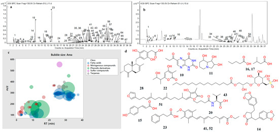 Base peak chromatograms (BPCs) of Spirulina extract in (a) the negative and (b) positive ionization modes; (c) bubble plot of the observed masses vs. the retention time in relation to metabolite classes; and (d) structures of the major compounds.