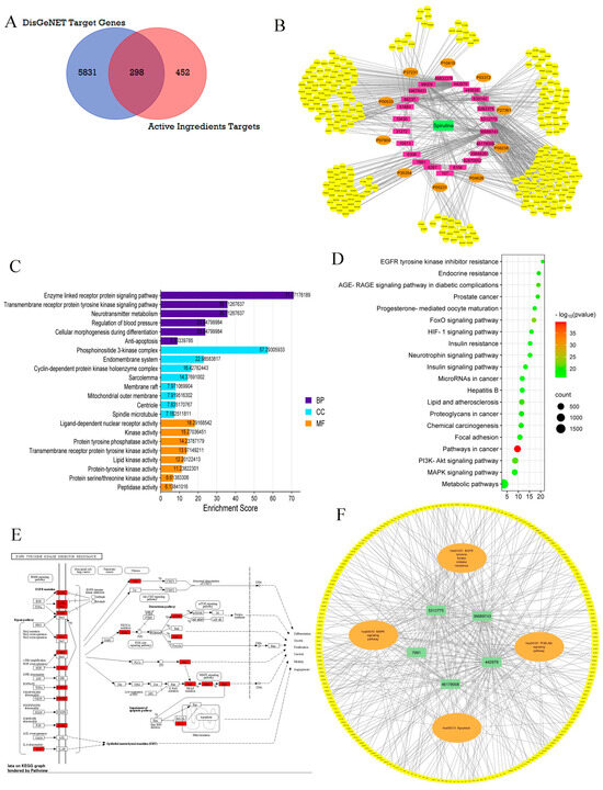 Prediction of SP by network pharmacology for BC treatment. (A) Venn diagram of component target and disease target. (B) SP-ingredients target network: the green rectangles represent SP, the purple rectangles represent ingredients, the orange circles represent the top 10 targets correlated to BC by the PPI network, and the yellow circles represent the other targets. (C) GO enrichment analysis of results for BC treatment of SP. (D) KEGG pathway enrichment analysis of results for BC treatment of SP. (E) EGFR tyrosine kinase resistance pathway. (F) The component–target pathway network.