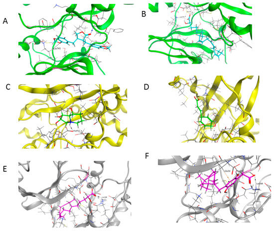 Three-dimensional representation of the most potent compounds against target enzymes: (A) hinokinin, 442879/EGFR (Green), (B) hydroxylinoleic acid II, 5312775/EGFR (Green), (C) swainsonine, 51683/PI3K (Yellow), (D) p-dihydrocoumaric acid, 129846263/PI3K (Yellow), (E) hydroxylinoleic acid II, 5312775/MAPK(ERK) (Gray), and (F) peyssonoic acid B, 46178008/MAPK(ERK) (Gray).