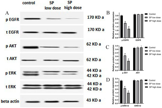 2.10. Effect of SP on Phosphorylated and Total EGFR, AKT, and ERK1/2