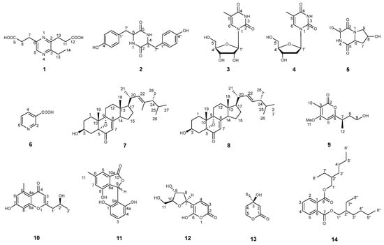 To highlight the metabolite modifications that are caused by fungal interactions, an HPLC chromatogram with UV detection (HPLC-UV) and molecular networking were adapted to the analysis of the crude EtOAc extract of a 30-day solid rice medium as previously reported [14]. Comparing the HPLC profiles (Figure S1a) of the whole co-culture to those from the monocultures demonstrated that compounds 1, 3–5, 7, 9, 12, and 14 were induced metabolites that were not produced when the two fungi were cultured alone. These observations were further confirmed by the UPLC-ESI-MS/MS-based molecular networking (Figure S1b) generated through the online Global Natural Products Social Molecular Networking (GNPS) platform; nevertheless, some minor components cannot be detected by this technique. The chemical investigation of the minor metabolites obtained following the co-cultivation of these two titled fungal strains, including a new alkaloid (1), a new sterol (7), a new pyranone (9), as well as 11 known compounds such as cyclo(L-Tyr-L-Tyr) (2) [15], 5-methyl-uridine (3) [16], thymidine (4) [17], cyclo(L-Hyp-L-Ala) (5) [18], nicotine acid (6) [19], 3β-hydroxy-5,9-epoxy-(22E,24R)-ergosta-7,22-dien-6-dione (8) [20], 2-(2′-hydroxypropyl)-5-methyl-7-hydroxychromone (10) [21], 3-(2,6-dihydroxyphenyl)-4-hydroxy-6-methyl-isobenzofuran-1(3H)-one (11) [22], 3-(2-deoxy-β-erythro-pentofuranosyl)-6-hydroxy-2H-pyran-2-one (12) [23], (R)-mevalonolactone (13) [24], and bis(2-ethylhexyl) phthalate (14) [25], were isolated from the co-culture extracts of DHS-48 and DHS-11 (Figure 1). Herein, we report on the phylogenetic analysis of fungal strains DHS-48 and DHS-11, followed by the isolation, structure elucidation, and biological activities of these compounds.