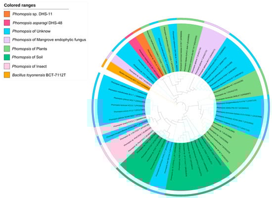 Unrooted neighbor-joining phylogenetic tree based on the ITS gene sequences showing the taxonomic positions of DHS-48, DHS-11, and type strains of closely related Phomopsis taxa. The values at each node represent the bootstrap values from 1000 replicates, and the scale bar represents 0.05 substitutions per nucleotide. Bacillus toyonensis BCT-7112T served as an outgroup.