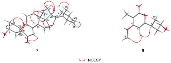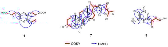 Key COSY and HMBC correlations of compounds 1, 7, and 9.