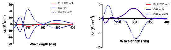 Experimental and calculated electronic circular dichroism (ECD) spectra of 7 and 9.