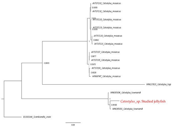 The comparison of characters between the studied Catostylus sp. and Catostylus townsendi highlighted that Catostylus townsendi possesses some peculiarities not shared with the studied jellyfish, such as highly dichotomous oral arms and conspicuous purple-brown spots on the exumbrella [11]. However, other morphological features, including a hemispherical-shaped exumbrella with an average diameter of 10 cm and slightly shorter oral arms than the exumbrella diameter, were alike in both the studied Catostylus sp. and Catostylus townsendi [19]. Nonetheless, Catostylus townsendi was the closest relative of the studied Catostylus sp., and these molecular data confirmed that the studied jellyfish is a Catostylus townsendi. Genetic distances also support the relationships observed in the phylogenetic tree. The phylogenetic tree, however, unexpectedly highlights that Catostylus townsendi fell into two clades. The two clades might be similar because Catostylust townsend is polyphyletic, or there is no morphological divergence of these taxa. However, a genetic difference was observed between the two.