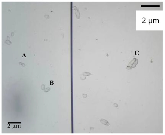 Light micrograph of nematocysts after autolysis at 10 × 10 magnification. (A) 4–6 µm, (B) 7–9 µm, (C) 14–16 µm.