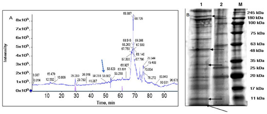 Proteins with a concentration of 12.56 + 0.07 μg/mL were recorded in the venom extract (Figure A2) prepared by sonicating 200 mg of nematocysts in 1200 mL of phosphate buffer. It indicated that nematocysts of this Catostylus sp. contain relatively high amounts of venom proteins. The crude extract of the venom fractioned by the C18 nano-LC column (Figure 3A) exhibited a prominent high peak at 68.726 min after entering the sample. From the collected fractions, 13 proteins were identified from the Catostylus sp. nematocyst venom extract. The spectrum exhibited seven major peaks with native molecular masses ranging from 6 to 245 kDa (Figure 3B), confirmed by the SDS-PAGE analysis of the toxin proteins in Catostylus sp. venom.