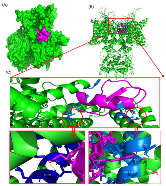 Three-dimensional toxin–potassium complex model from the ClusPro method. (A) Surface model. (B) Cartoon model. (C) Visualization of polar–polar interaction between the toxin–potassium channel complex. (Human voltage-gated potassium channel Kv3.1 (PDB ID-7PHH) is displayed in green, and the potassium channel toxin alpha-KTx 1.13 (UniProtKB—P59944) is displayed in purple, and active residues of the potassium channel are displayed in blue sticks).