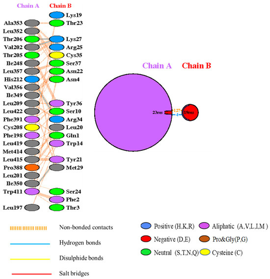 The 2D interaction representation, including hydrogen bonds, salt bridges, and nonbonded interactions between human voltage-gated potassium channel Kv3.1 and potassium channel toxin alpha-KTx 1.13. (Chain A represents the human voltage-gated the potassium channel, and Chain B represents the potassium channel toxin).