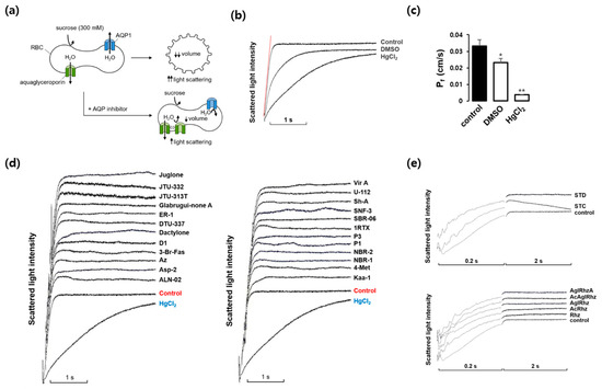 Effects of various marine natural products on osmotic water permeability in mouse erythrocytes. (a) Assay method. Erythrocytes were subjected to a 300 mM sucrose gradient. A rapid decrease of the cell volume due to the water efflux through AQPs increased light scattering intensity. AQP inhibitors prevented water efflux and cell shrinkage. (b) Osmotic water permeability (Pf) was measured from the initial slope of the time course of scattered light intensity (a red line). Control (sucrose alone), DMSO (dimethylsulfoxide, 0.1%), and HgCl2 (0.5 mM). (c) The Pf values calculated from traces in (b). Values are the mean ± SD. * p < 0.05, ** p < 0.01. (d) The representative light scattering traces for 24 marine natural compounds (100 nM) in response to 300 mM sucrose. (e) The representative light scattering traces for stichoposide C (STC), stichoposide D (STD), rhizochalin (Rhz) and its derivatives in response to 300 mM sucrose. AglRhz, aglycon of rhizochalin; AcRhz, peracetyl rhizochalin; AcAglRhz, peracetyl aglycon of rhizochalin; AglRhzA, aglycon of rhizochalin A.