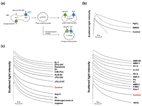 Effects of various marine natural products on glycerol permeability in mouse erythrocytes. (a) Assay method. Mouse erythrocytes were subjected to a 300 mM glycerol gradient. A rapid decrease of the cell volume (increased light scattering) due to the water efflux through AQPs was followed by cell re-swelling (decreased light scattering) due to glycerol and water influx. Aquaglyceroporin inhibitors prevented the late re-swelling phase. (b) Glycerol permeability was measured from the slope of the late decreasing phase of light scattering (a red line) in response to a 300 mM inwardly directed glycerol gradient (control). HgCl2 (0.5 mM); DMSO, dimethylsulfoxide (0.1%). (c) The representative light scattering traces for 24 marine natural compounds (100 nM) in response to 300 mM glycerol.