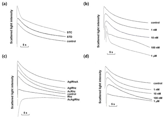Effects of stichoposide, rhizochalin, and their derivatives on glycerol permeability in mouse erythrocytes. (a) The representative light scattering traces for stichoposide C (STC, 1 μM) and stichoposide D (STD, 1 μM) in response to 300 mM glycerol. (b) The representative light scattering traces for the absence (control) or presence of the indicated concentrations of STC in response to 300 mM glycerol. (c) The representative light scattering traces for 1 μM of rhizochalin (Rhz) and its derivatives in response to 300 mM glycerol. AglRhz, aglycon of rhizochalin; AcRhz, peracetyl rhizochalin; AcAglRhz, peracetyl aglycon of rhizochalin; AglRhzA, aglycon of rhizochalin A. (d) The representative light scattering traces for the absence (control) or presence of the indicated concentrations of Rhz in response to 300 mM glycerol.