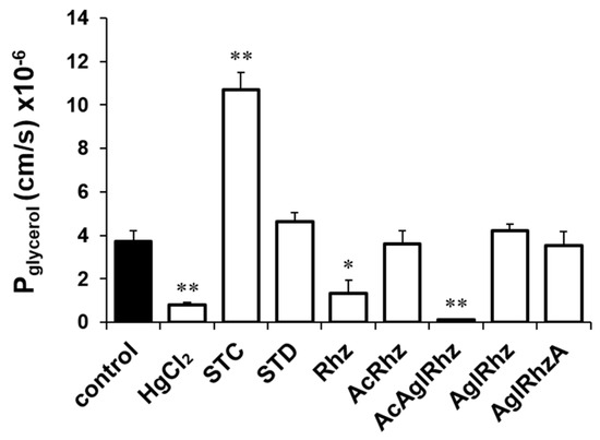 Glycerol permeability coefficients (Pglycerol) of mouse erythrocytes. The Pglycerol value was calculated from the late decreasing phase of light scattering traces in the presence of 300 mM glycerol alone (control) or together with stichoposide (STC), rhizochalin (Rhz), and their derivatives (100 nM). STD, stichoposide D; AglRhz, aglycon of rhizochalin; AcRhz, peracetyl rhizochalin; AcAglRhz, peracetyl aglycon of rhizochalin; and AglRhzA, aglycon of rhizochalin A. Values are the mean ± SD (n = 20). * p < 0.05, ** p < 0.01 according to Student’s t-tests.