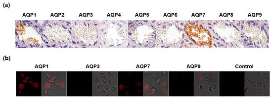 Expression of AQP subtypes in CD1 mouse erythrocytes. (a) Immunohistochemistry of paraffin-embedded kidney sections using anti-AQP1-AQP9 antibodies. (b) Immunofluorescence analysis of glutaraldehyde-fixed erythrocyte suspensions using anti-AQP antibodies. Control, secondary antibody alone.