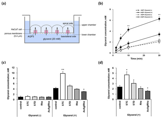 AQP3-mediated transepithelial glycerol transport in HaCaT cell monolayers. (a) Assay method. YFP-hAQP3 HaCaT cells grown on permeable supports were exposed to 20 mM glycerol in the lower chamber of the Transwell. The basal-to-apical glycerol transport across the cell monolayer was assessed by measuring the glycerol concentration in the upper chamber as well as inside the cells. (b) The glycerol concentrations of the upper chamber bathed on the apical side of YFP-hAQP1 and YFP-hAQP3 HaCaT cells at the indicated time points. (c) The glycerol concentrations of the upper chamber bathed on the apical side of YFP-hAQP3 HaCaT cells at 10 min. 1 μM of stichoposide C (STC), stichoposide D (STD), rhizochalin (Rhz), or peracetyl aglycon of rhizochalin (AcAglRhz). (d) The glycerol concentrations inside YFP-hAQP3 HaCaT cells at 30 min. Values are the mean ± SD (n = 10). * p < 0.05, ** p < 0.01 according to one-way ANOVA followed by Duncan’s test.