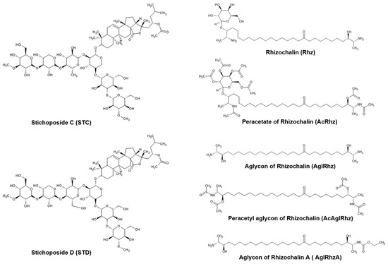 - Kitagawa, I.; Kobayashi, M.; Inamoto, T.; Yasuzawa, T.; Kyogoku, Y. The Structures of Six Antifungal Oligoglycosides, Stichlorosides A1, A2, B1, B2, C1, and C2, from the Sea Cucumber Stichopus Chloronotus (BRANDT). Chem. Pharm. Bull. 1981, 29, 2387–2391. [Google Scholar] [CrossRef]