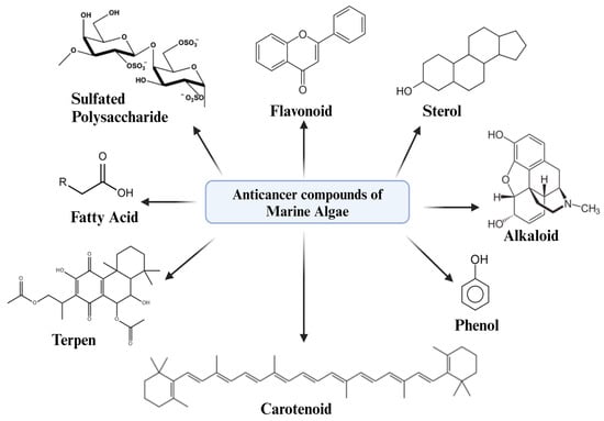 There are two types of marine algae, macroalgae and microalgae. Both contain a wide variety of biomolecules, some of which have strong anticancer properties, including alkaloid, fatty acids, phenolics, terpenes, sulfated polysaccharides (SPs), carotenoids, sterols, and phycobiliproteins [,,]. The utilization of marine algal in drug development presents several benefits, such as their rapid generation time, metabolic flexibility, lack of rivalry for arable land, ability to grow in any season, and minimal need for specialized nutrients []. Likewise, bioactive substances discovered in algae have been witnessed to possess anticancer capabilities by causing apoptosis and preventing cell division through disrupted signaling pathways [].