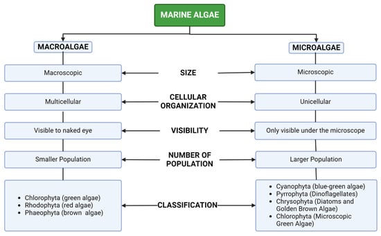 Algae are part of the plant kingdom’s earliest evolutionary tiers and are different in their ability to photosynthesize. Algae are divided into two categories: macroalgae and microalgae (Figure 2). Macroalgae, frequently referred to as “seaweeds” are multicellular marine creatures that resemble large plants. Color-based classifications include Rhodophyta, Chlorophyta, and Phaeophyta, also known as red, green, and brown algae, respectively []. Meanwhile, microalgae are small photosynthetic organisms that live in both saltwater as well as freshwater environments that belong to a varied group of organisms, including photoautotrophic protists such as prokaryotic cyanobacteria, which are additionally known as blue-green algae. The distinct features between macroalgae and microalgae are presented in Figure 2. Microalgae account for almost 70% of global biomass, and they generate molecules like carbohydrates, protein, and lipids. Microalgae are photosynthetic micro-organisms with a lack of cell organelles compared to land-based plants. Microalgae can grow via photosynthesis in the presence of CO2, solar light, and water. The cultivation can be carried out in marginal ponds, raceway ponds, and synthetic tanks [].