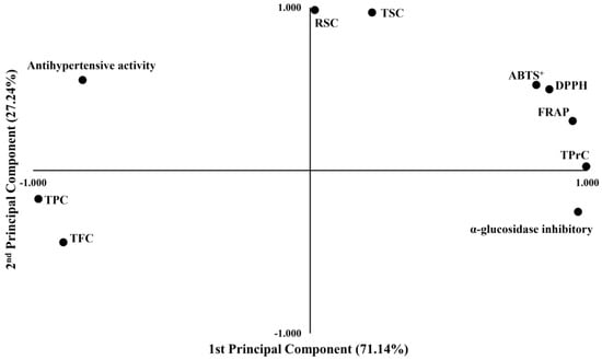 Principal component analysis (PCA) involves a mathematical procedure that identifies patterns in a data set and then expresses the data in such a way as to highlight their similarities and differences. This study analyzed the relationship between chemical properties and biological activities using PCA (Figure 1). The plot shows that components 1 and 2 explain most data variance. The observations from the PCA biplot largely align with those from Pearson correlation studies. PCA achieved a total variance explanation of 98.38%, with the first and second principal components accounting for 71.14% and 27.24% of the variance, respectively. Notably, TPC and TFC have negative values in components 1 and 2, suggesting they share similar characteristics. In contrast, RSC and TSC exhibit very high positive values in component 2, indicating that these chemical properties tend to vary. Additionally, variables such as ABTS+, DPPH, FRAP, and α-glucosidase inhibitory have positive values in component 2. The fact that these variables show an opposite variance pattern compared to TPC and TFC is likely due to the IC50 method used, where lower values indicate higher biological activity. This also explains why TPrC and antihypertensive activities are positioned oppositely. Previous studies using subcritical water to assess TPC and antioxidant activity have yielded similar results [68,69]. While this study has elucidated the relationship between components and activities through overall analysis, further research is needed to increase the reliability of the analysis by including more samples and components. Additionally, further studies using different analytical techniques are required to clarify the relationships between variables.