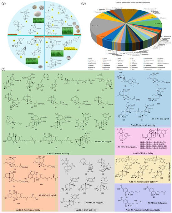 Illustration of statistical data analysis: (a) representative terpenoid compounds with antimicrobial activity; (b) count of antimicrobial strains and their corresponding compounds. (c) Terpenoid compounds with selective antimicrobial activity against targeted bacterial strains.
