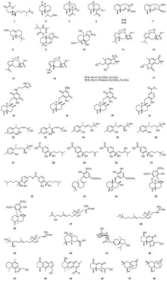 The chemical structures of sesquiterpenoids 1–48 are depicted in Figure 2, while the remaining information, including names and marine sources, is presented in Table 1.