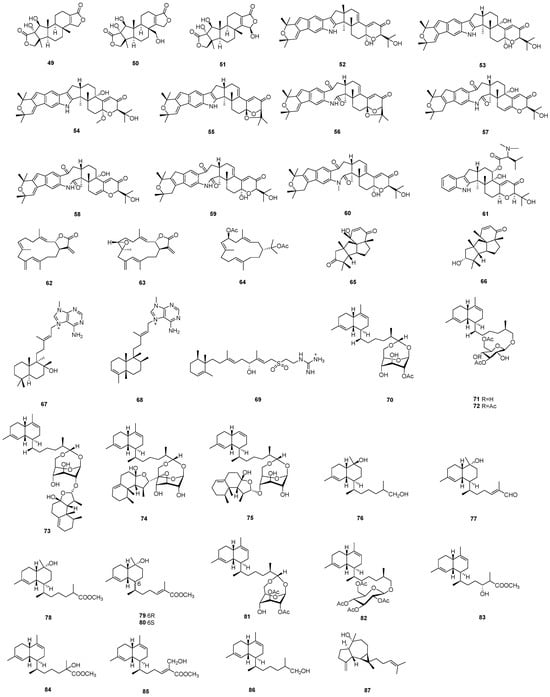 Diterpenoids are a class of naturally occurring secondary metabolites with complex and diverse structures and biological activities, composed of 20 carbon atoms with extensive skeletal rearrangements [32]. This section presents 39 diterpenoid compounds, encompassing three 5,5,6,6,5-pentacyclic spongian diterpenes, nine indole diterpenes, one indole diterpene amino acid conjugate, three membrane diterpenes, two cyclopiane diterpenes, three diterpene alkaloids, six bicyclic diterpene glycosides, seven biflorane-type diterpenoids, and four decalin-type bicyclic diterpenes. The chemical structures of diterpenoids 49–87 are depicted in Figure 3, while the remaining information, including names and marine sources, is presented in Table 2.