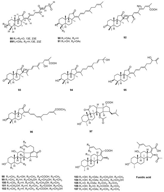 Triterpenoids are a class of ubiquitous natural organic compounds in nature, consisting of six isoprene units, totaling 30 carbon atoms. This section introduces 20 triterpenoid compounds, including details on the names, sources, and structures of the nine isomalabaricane terpenoids and eleven fusicane-type nortriterpenoids. The chemical structures of triterpenoids 88–107 are depicted in Figure 4, while the remaining information, including names and marine sources, is presented in Table 3.