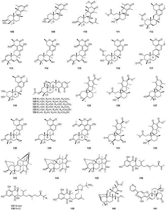 Meroterpenoids are hybrid secondary metabolites from mixed biosynthetic pathways, partially derived from terpenoid substrates. These compounds, produced widely by bacteria, algae, plants, and animals, exhibit remarkable chemical diversity by combining terpenoid frameworks with polyketides, alkaloids, phenols, and amino acids [43,44,45]. The chemical structures of meroterpenoids 108–141 are depicted in Figure 5, while the remaining information, including names, marine sources, and results of antibacterial activity assays, is presented in Table 4.