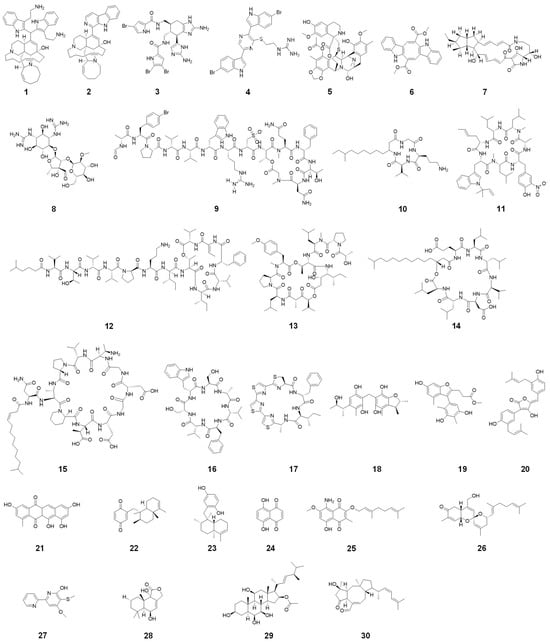 - Liang, J.; She, J.; Fu, J.; Wang, J.; Ye, Y.; Yang, B.; Liu, Y.; Zhou, X.; Tao, H. Advances in natural products from the marine-sponge-associated microorganisms with antimicrobial activity in the last decade. Mar. Drugs 2023, 21, 236. [Google Scholar] [CrossRef]