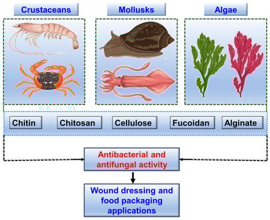 | Chitosan | Crustaceans | Antibacterial and antifungal activity [119,121] | Cell membrane disruption, suppression of protein and DNA synthesis, and chelation of essential nutrients | |