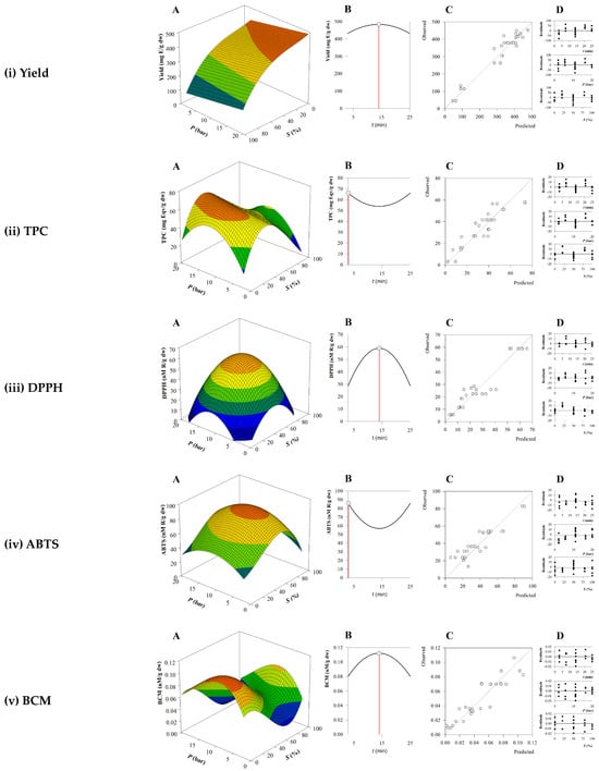Later, using the experimental data of the 28 different combinations of conditions (denoted as X1:t, X2:P, and X3:S) utilized in the MAE, fitting to the polynomial models using Equation (1) was performed. On the other hand, the estimated parametric values for each response—yield, TPC, DPPH, ABTS, and BCM—and numerical statistical criteria were obtained and are presented in Table 2. Those coefficients reflected as non-significant (ns) were not considered for the model development and are not displayed. The responses shown in Table 2 were correlated with the three independent variables using the polynomial equation by considering only the statistically significant coefficients (p < 0.05) to build simplified non-linear equations for each response presented below (Equations (3)–(7)):