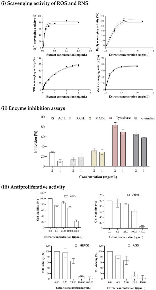 (i) Dose–response curves of superoxide anion radical, hydroxyl radical, hydrogen peroxide, and nitric oxide radical scavenging activities—dotted lines stand for 95% confidence levels. (ii) Inhibition response of enzyme tested at the extract concentrations of 2 and 1 mg/mL. (iii) Dose–response bars of A549, HepG2, AGS, and Vero cell inhibition rates—error bars represent the standard deviation; n = 3.