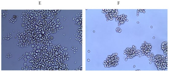 Dose-dependent antiviral activity of fucoidan 3 (LIF) on syncytia formation in HIV-infected MT-4 cells (pre-treatment of virus). (A) Concentration 25 µg/mL; (B) concentration 50 µg/mL; (C) concentration 100 µg/mL; (D) concentration 150 µg/mL; (E) virus control; (F) cell control.