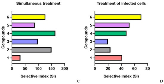 In the case of treatment with fucoidans (1, 4, and 6) after adsorption and entry of the virus into cells (treatment of infected cells), moderate viral inhibitory activity of the compounds (SI = 53.3) was found, though it was 2.2-fold higher than that of the PI drug (SI = 24.6) (p ≤ 0.05) (Figure 2D).