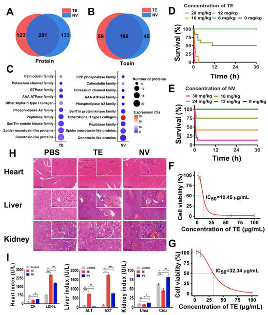 Comparison and toxicity evaluation of toxins in TE and NV. (A) Venn analysis of proteins between TE and NV groups, n = 4. (B) Venn analysis of toxins between TE and NV groups, n = 4. (C) Overview of toxin family distributions and protein number and expression in TE and NV identified in the proteomes. (D) Survival analysis of ICR mice after TE injections, n = 12. (E) Survival analysis of ICR mice after NV injections, n = 12. (F) Viability of RAW264.7 cells exposed to TE, n = 6. (G) Viability of RAW264.7 cells exposed to NV, n = 6. (H) HE analysis of the heart, liver, and kidneys at 400× magnification, n = 4. (I) Evaluation of blood biochemical indices, including creatine kinase (CK) and lactate dehydrogenase (LDH), aspartate aminotransferase (AST), alanine aminotransferase (ALT), creatinine (CREA), and urea nitrogen (UREA), n = 3. * p < 0.05, ** p < 0.01, and *** p < 0.001 represent the comparison of the group with the control group, and # p < 0.05, ## p < 0.01, and ### p < 0.001 represents the comparison of the group with the TE group, with ns representing no significance.