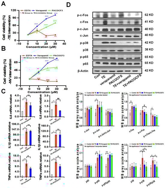 PACOCF3 and verapamil antagonized TE or NV toxicity in vitro. (A,B) Inhibition of TE or NV cytotoxicity in RAW264.7 cells by 10–30 μM EDTA, PACOCF3, and verapamil. n = 6. (C) Relative gene expression levels of three inflammatory factors, namely IL-6, IL1β, and TNF-α, in RAW264.7 cells treated with TE (10.45 μg/mL) or TE combined with PACOCF3 (20 μM) or verapamil (20 μM), n = 3. (D) Western blotting analysis of c-Fos, c-Jun, p65, and p38 phosphorylated and non-phosphorylated proteins, n = 4. * p < 0.05, ** p < 0.01, and *** p < 0.001 represent the comparison of the group with the control group, and # p < 0.05, and ## p < 0.01 represents the comparison of the group with the TE group, with ns representing no significance.