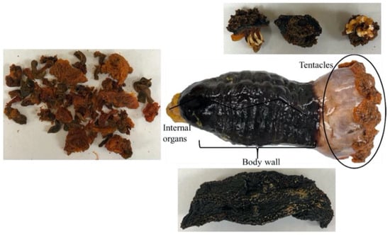 The structure of sea cucumber, C. frondosa (fresh sea cucumber entirety and dehydrated parts). Adapted from Hossain et al. (2020) [3]; the pictures of dehydrated parts were taken on samples provided by AKSO Marine Biotech Inc. (Hacketts Cove, NS, Canada).