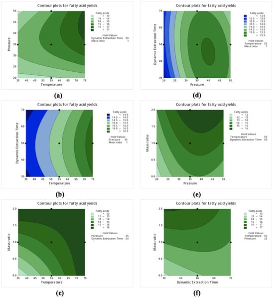 Maximum yields of over 17 g of FAs and more than 3.2 g of EPA and DHA in 100 g of samples on a dry weight basis could be obtained at a temperature of about 73–75 °C and a pressure of approximately 36–47 MPa with constant dynamic extraction time and co-solvent/feedstock mass ratio (Figure 2a and Figure 3a). Pressure and temperature directly affect the density of the supercritical fluid, so higher pressures and higher temperatures might improve the solvating power of the supercritical fluid for FAs, leading to an increase in extraction yields. Moreover, higher temperatures enhance the intensive thermal motion of compounds, allowing easier transfer from samples to the supercritical solvents and thus increasing the solubility of FAs and contributing to higher extraction yields.