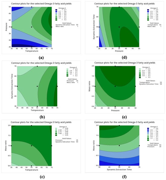 Contour plots for the selected omega-3 FA yields (g/100 g of feedstock on a dry weight basis) from scCO2 extraction of hot-air-dried C. frondosa viscera. Non-targeted variables were maintained at their median values, with the temperature at 55 °C, pressure at 35 MPa, dynamic extraction time at 50 min, and the co-solvent/feedstock mass ratio at 1.