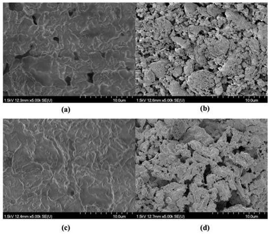 To obtain a better understanding of the samples undergoing different drying methods, SEM was employed to analyze hot-air-dried and freeze-dried samples before and after scCO2 extraction under the optimal conditions (Figure 4). The surface structure of the freeze-dried material (Figure 4c) showed more obvious cracks and alternations than the air-dried material, indicating that freeze-drying led to the alteration of the biomass surface. Taher et al. (2014) found the surface structure of samples was cracked and altered by freeze-drying pre-treatment in comparison with sun-dried samples [39]. Sample rigidity was greater for hot-air-dried samples because of the low drying temperature and higher moisture content [40]. The lower rigidity of freeze-dried samples likely made it easier for them to be broken into smaller particles under the stream of scCO2, leading to a larger surface area and then further increasing the contact with extraction solvents. Therefore, freeze-drying may have improved the mass transfer within samples while also allowing scCO2 to penetrate the freeze-dried sample matrix more easily, enhancing lipid dissolution, and hence, the FA yields.