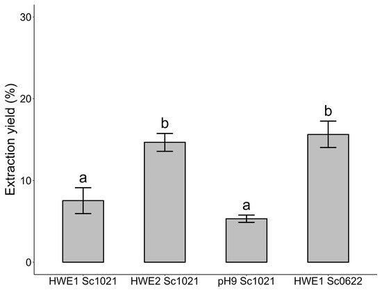 Yields (%) using different methods for extracting polysaccharides from the red alga Solieria chordalis. Different letters represent significant differences according to Tukey’s pairwise a posteriori test after ANOVA (p < 0.001). Sample size: n = 3.