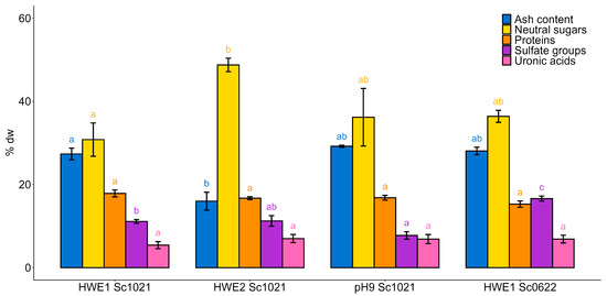 The biochemical composition of the different extracts was characterized (Figure 2). Hot water extracts from the S. chordalis collected in June showed the highest amount of sulfate groups (16.60%), while hot water extracts from the S. chordalis collected in October did not exceed 12%. The protein content was not significantly different among the samples and ranged from 15.27% (HWE1 Sc0622) to 17.84% (HWE1 Sc1021). HWE2 Sc1021 showed the highest content of neutral sugars (48.73%), while its ash content was inferior at 16.00%. The extraction at pH 9 led to the lowest sulfate group content (7.73%). Analysis of the molecular weight profiles obtained by High-Pressure Size-Exclusion Chromatography (HPSEC) yielded a weight greater than 1.3 MDa for all extracts.