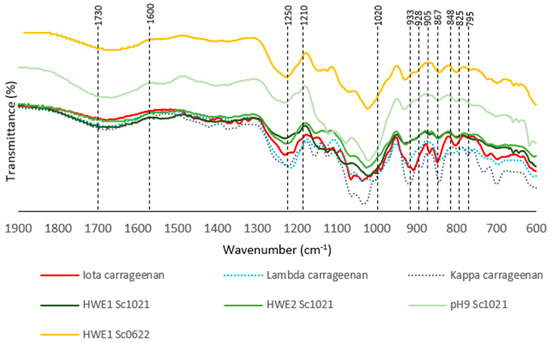 Based on the FTIR spectra of the hot water extracts, the samples were found to contain iota (ι)-type carrageenan by comparing to the commercial κ -, ι-, and λ-carrageenan spectra and the information available in the published literature on the same species. The FTIR spectra in the range of 1900 to 600 cm−1 were studied (Figure 3). Table 3 summarizes the characteristic vibrational and elongation bond wavenumbers observed from red algal galactanes, as well as the associated osidic subunits and polysaccharides [12,13,14,15]. All spectra (standards and samples) showed a large and intense band from sulfate esters at 1210–1250 cm−1. Signals corresponding to the linked C-O of the 3,6-anhydrogalactose ring were also detected at 1020 cm−1 and 928–933 cm−1 except in the λ-carrageenan standard spectrum. Additionally, the bands at 905 cm−1 and 795 cm−1, specific to the C-O-SO3 bond on C2 of 3,6-anhydrogalactose in ι-carrageenan, were present in the spectra for the corresponding standard and the samples. The 1600–1730 cm−1 interval contained broad, low-intensity bands due to the presence of C=O bonds, which are involved present in various functional groups such as aldehydes, ketones, esters, and carboxylic acids. The presence of these different specific signals enabled the identification of the presence of ι-carrageenan in the different fractions after extraction.