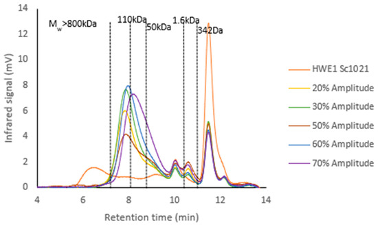 Chromatograms of the molecular weight profiles of HWE1 Sc1021 extract before and after depolymerization using different amplitudes.