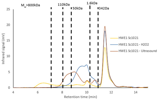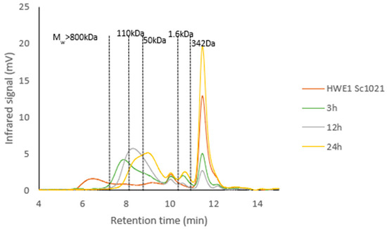 HWE1 Sc1021 was depolymerized using an ultrasound process for 3, 12, and 24 h at 50% amplitude. All three conditions reduced the molecular weight, resulting in fractions of 304 kDa, 85 kDa, and 23 kDa after 3, 12, and 24 h, respectively (Figure 6). Nevertheless, the polydispersity index (PD) was greater than 3 for the 12 h and 24 h samples in comparison with the 3 h depolymerization sample (PD = 1.60).
