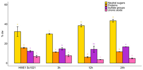 Biochemical composition of fractions after depolymerization using ultrasound for different durations. Statistically significant differences are indicated by different letters from a to d (p < 0.05). Different letters represent significant differences according to the Kruskal–Wallis a posteriori test. Sample size: n = 3.