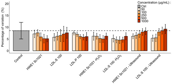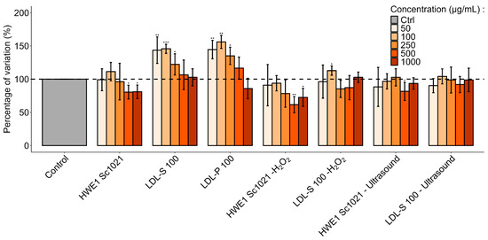The effects of the carrageenan-rich fractions (HWE1 Sc1021, LDL-S 100, and LDL-P 100) and low-molecular-weight fractions after depolymerization using hydrogen peroxide or ultrasound on human dermal fibroblast proliferation were evaluated using the WST-1 assay (Figure 10). Fibroblast cells were treated for 72 h with 50, 100, 250, 500, and 1000 μg/mL of the different fractions.