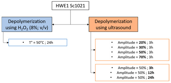 HWE1 Sc1021 was depolymerized by radical depolymerization using H2O2 (50 °C for 24 h) and ultrasound methods (50% amplitude for 24 h). The biochemical composition of the extracts was analyzed (Table 4) as well as the monosaccharide compositions and weight profiles (Figure 8).