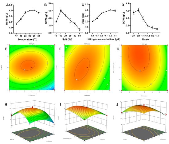 | Run | A: Temperature (°C) | B: Salinity (%) | C: N Ratio | D: N Concentration (g/L) | DCW (g/L) |