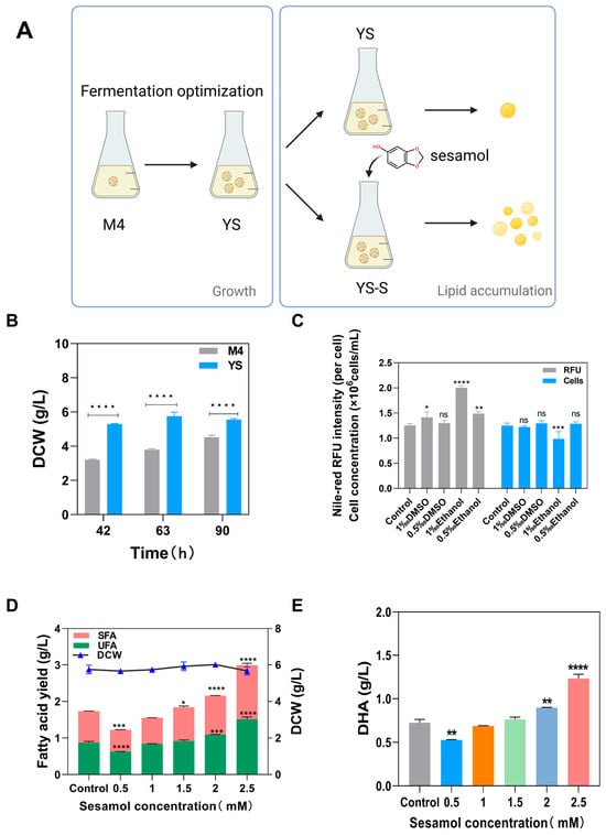 - Bao, Z.; Zhu, Y.; Feng, Y.; Zhang, K.; Zhang, M.; Wang, Z.; Yu, L. Enhancement of lipid accumulation and docosahexaenoic acid synthesis in Schizochytrium sp. H016 by exogenous supplementation of sesamol. Bioresour. Technol. 2022, 345, 126527. [Google Scholar] [CrossRef]
